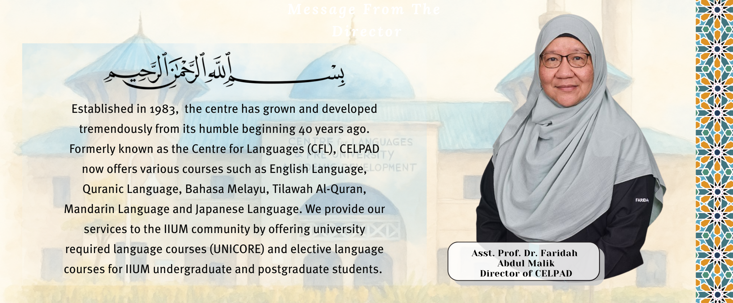 CELPAD was formerly known as the Centre for Languages (CfL). It was established in July 1983, together with the Centre for Fundamental Knowledge, the Kulliyyah of Economics, and the Kulliyyah of Laws.In May 1993, CfL was renamed the Centre for Languages and Pre-University Academic Development (CELPAD) to align with the Philosophy, Vision, and Mission of the International Islamic University Malaysia (IIUM), and to take on the responsibility of introducing a new system for language teaching and learning at the University.