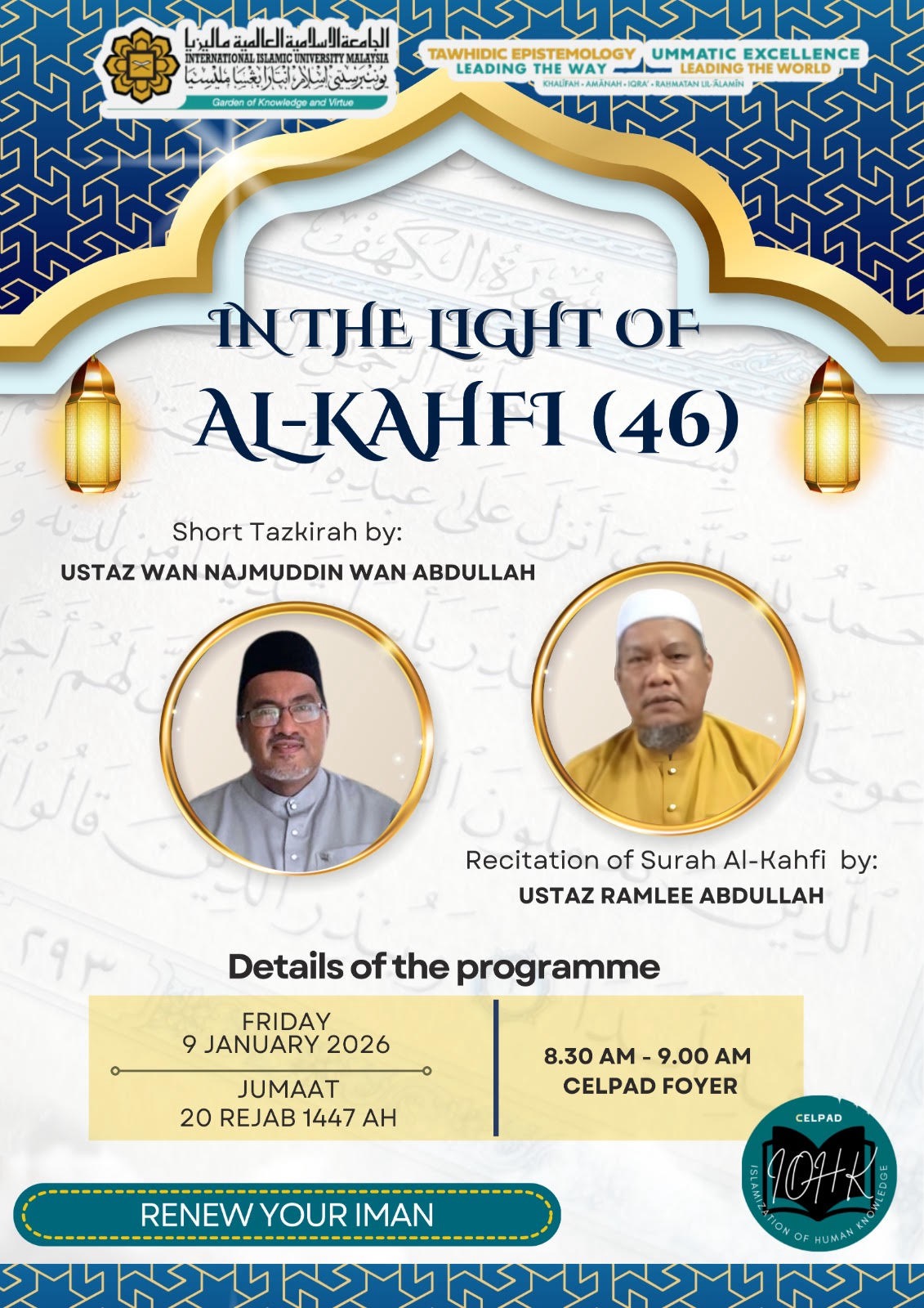 Gathering to recite the Quran and to remember Allah are among the recommended acts of worship, as in the Hadith narrated by Abu Hurairah ra in which the Prophet saw said, “There is no group of people that assemble in one of the Houses of Allah to recite the Book of Allah, learning and teaching it, except that tranquillity will descend upon them, mercy will engulf them, angels will surround them and Allah will make mention of them to those (the angels) in His proximity.” [Muslim] The Islamization of Human Knowledge (IOHK) unit, CELPAD, will be organizing a monthly Surah al-Kahfi recitation. The event will take place physically in CELPAD Sejahtera Garden and CELPAD Foyer in front of TEMU Office, on the first Friday of every month. The objective of the programme is to internalise one of the sunnahs of our holy prophet which is to recite surah Al-Kahfi on Friday. It will also give the staff a short moment to ponder, reflect and refresh the meaning of life and the duty as the servant of Allah and the khalifah in this world. The event of this month is scheduled as follows: Date/Day: 9th January 2026 / Friday Venue: CELPAD Foyer Schedule: 8.20 am – Arrival of participants 8.30 am – Recitation of Surah al-Kahfi led by Ustaz Ramlee Abdullah, Tilawah Division. 8.50 am – A Short Tazkirah by Ustaz Wan Najmuddin Wan Abdullah, Quranic Language Division. 9.00 am – Disperse. All CELPAD staff are invited to this session to embrace the Light of al-Kahfi. We kindly seek the cooperation of all attendees to be punctual. Thank you. Please don’t forget to click I-ATTEND to mark your attendance. https://iattend.iium.edu.my/participant/index/TCbJrYfjnU-1767667749 Prepared by : Islamization of Human Knowledge Unit (IOHK) , CELPAD