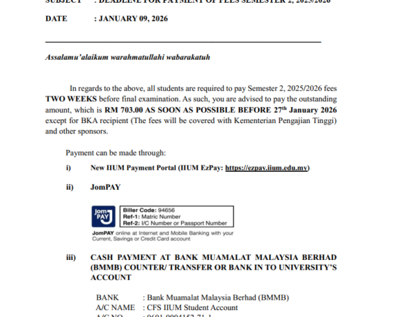ANNOUNCEMENT REGARDING DEADLINE FOR PAYMENT OF SEMESTER 2 2025 2026 FEES