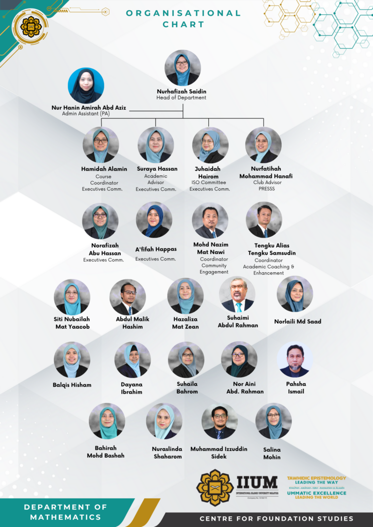 The Mathematics Department, an integral part of the Centre for Foundation Studies at IIUM, has been shaping minds since its inception in June 2010. With a dedicated team of 24 members, including 23 academics and 1 administrative assistant, we are committed to the academic growth of our students. Our accomplished faculty members specialize in delivering Mathematics, Statistics and Introduction to Mathematics for Computing courses, catering to a diverse range of Sciences programs, such as Allied Health Science, Biological Science, Dentistry, Engineering, Computer Science, Medicine, Nursing, Pharmacy, and Physical Science.