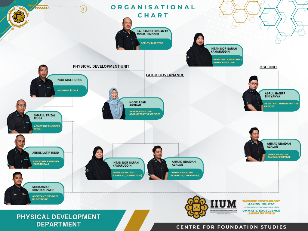 Physical Development Department (formerly known as the Facilities Management Department) was established in July 2020. The department was rebranded to the Physical Development Department effective on 15 March 2022. This department is under the purview of the Office of Director in which the scope of work of the Physical Development Department are Physical Development Project, Maintenance Works, Campus Development Liaison, Campus Beautification, Occupational Safety and Health, andAsset Management (Building). Currently, PDD has three Units which are Physical Development Unit, Good Governance and Occupational Safety & Health Unit.