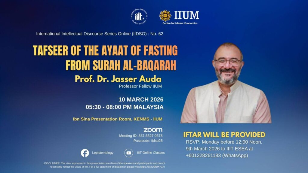 The International Intellectual Discourse Series Online (IIDSO) hosted its 62nd session on 10 March 2026, from 5:30 to 8:00 PM Malaysia time. Titled Tafseer of the Ayaat of Fasting from Surah Al-Baqarah, the session was delivered by Prof. Dr. Jasser Auda, a Professor Fellow at the International Islamic University Malaysia (IIUM). Held at the Ibn Sina Presentation Room, KENMS, IIUM, the event was also made available online via Zoom. Organized by Iepistemology and IIIT Online Classes in collaboration with IIIT ESEA, the session offered iftar for in-person attendees, with RSVPs requested by 9 March 2026. As stated in the event disclaimer, the views expressed were those of the speakers and participants and did not necessarily reflect the views of IIIT.