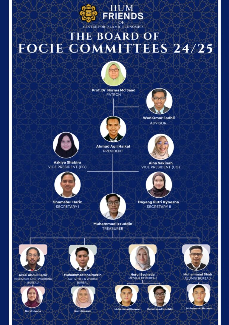 Friends of Centre for Islamic Economics (FoCIE) is a student-based society that is positioned under the purview of the Centre for Islamic Economics (CIE), KENMS, IIUM consisting of postgraduate and undergraduate KENMS students. Its main purpose is to become a strategic partner of Centre for Islamic Economics (CIE) that will link the students the mission and vision of the organisation. The main aim is to assist the fellow researchers in the CIE in their works of activities while at the same time to captivate the interest of the young future researchers among the students and giving them the exposure in activities related to research on Islamisation of modern economics. While many of the past of CIE’s programmes have been organised consisting only of the participants among the lecturers and the CIE fellows, the establishment of FoCIE will invite wider participations among the group of students especially those who are keen to join with the mission and vision of CIE. At the same time, the organisation can set up itsr own beneficial activities that will spread the movement of Islamisation of modern Economics following the mission and vision of CIE among the students.