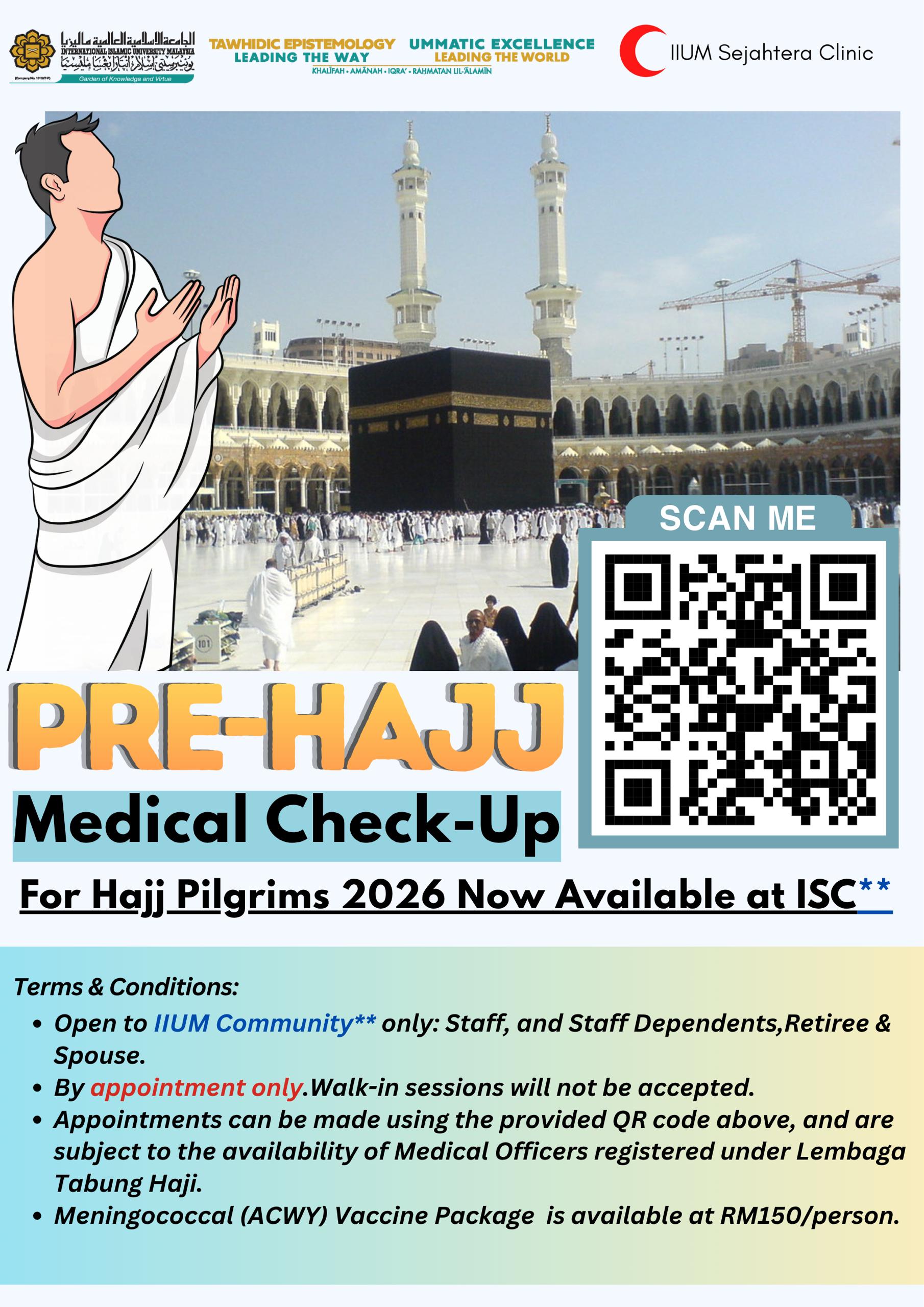 IIUM Sejahtera Clinic (Gombak Campus) is now offering Pre-Hajj Medical Check-Up for Hajj pilgrims 2026.