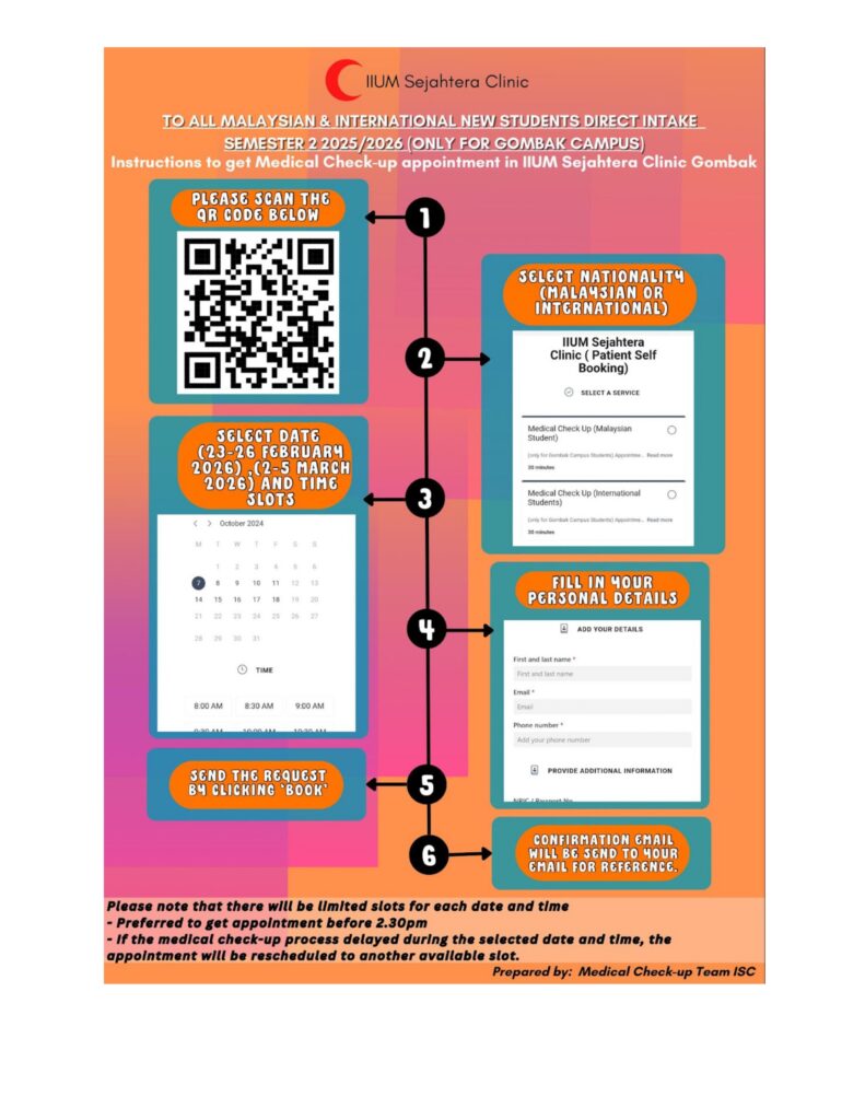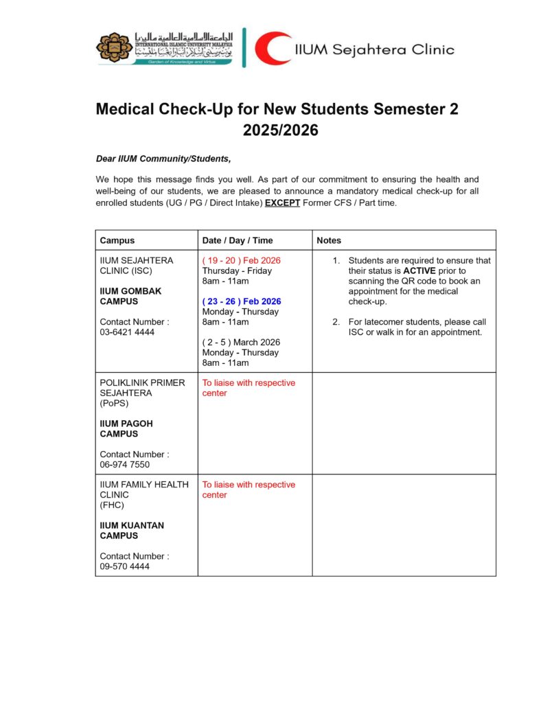 MANUAL E-GUARANTEE LETTER (INFOGRAPHIC) VIA HRMIS 2.0 MEDKAD INFO GHSI INFO QR CODE APPOINTMENT FOR MEDICAL CHECK-UP PROGRAMME (NEW STUDENT SEMESTER 2 2025/2026 - ISC GOMBAK ONLY) Link Appointment for Medical Check Up Programme (New Student Semester 2 2025/2026 – ISC Gombak Only)