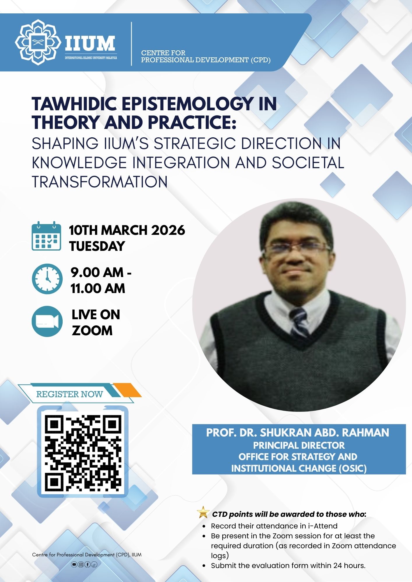 CPD WEBINAR: TAWHIDIC EPISTEMOLOGY IN THEORY AND PRACTICE: SHAPING IIUM’S STRATEGIC DIRECTION IN KNOWLEDGE INTEGRATION AND SOCIETAL TRANSFORMATION