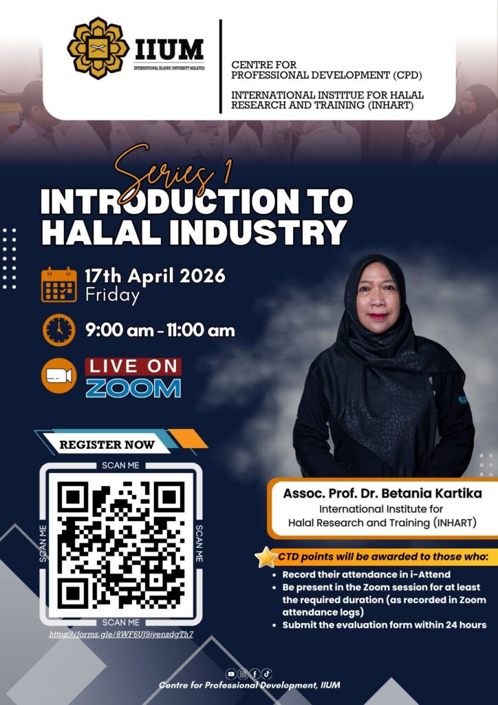 The Centre for Professional Development (CPD) in collaboration with International Institute for Halal Research and Training (INHART) would like to invite all IIUM community to enroll in this webinar, which will be held as follows: