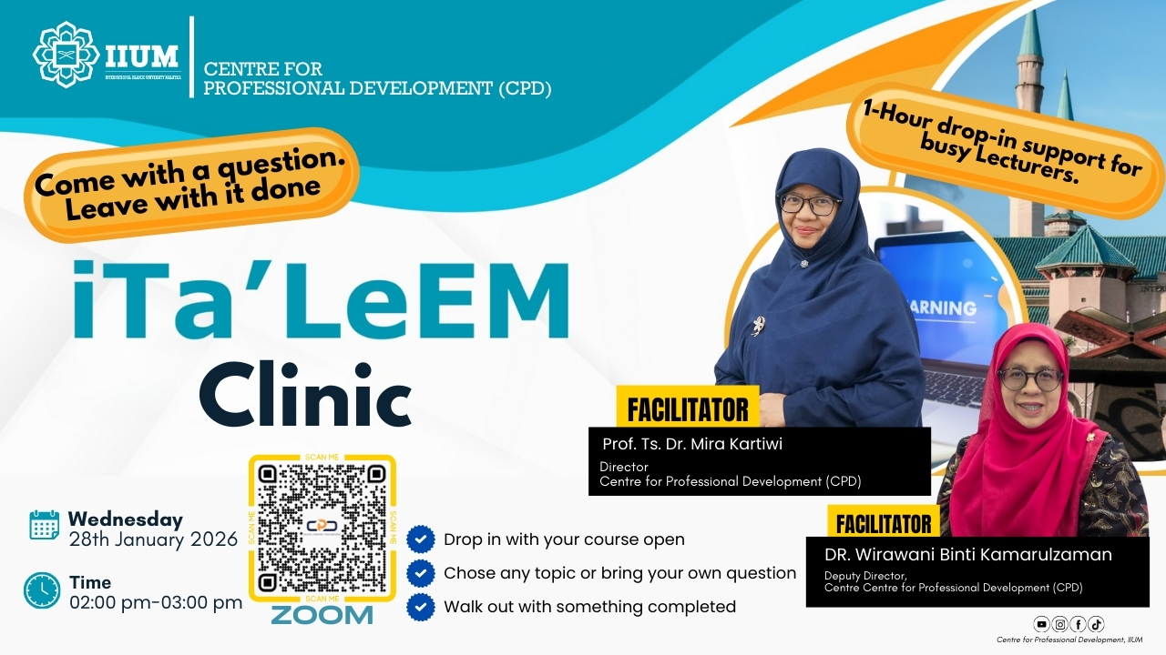 The Centre for Professional Development (CPD) is delighted to invite all IIUM academic staff to join our upcoming iTa’LeEM Clinic!